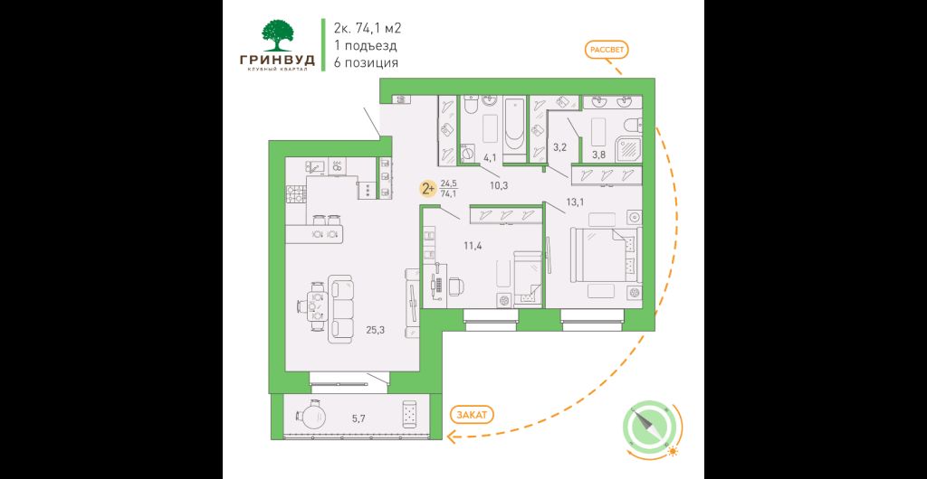 | Площадь (кв.м.) | Общая: 74.1 Жилая: 24.5 Кухня: 25.3 74.1 / 24.5 / 25.3 |