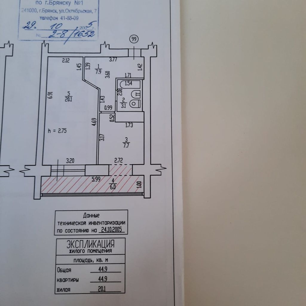 | Площадь (кв.м.) | Общая: 44.9 Жилая: 20.1 Кухня: 7.7 44.9 / 20.1 / 7.7 |